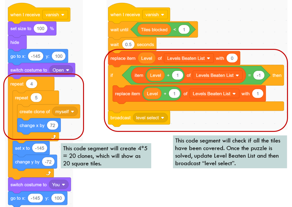 There are three parallel code segments of “when I receive vanish”. In the first parallel segment, the program will create 20 clones of Game Sprite which are aligned as 4 rows by 5 columns. All of those clones use Open costume, which is shown as Gray color.