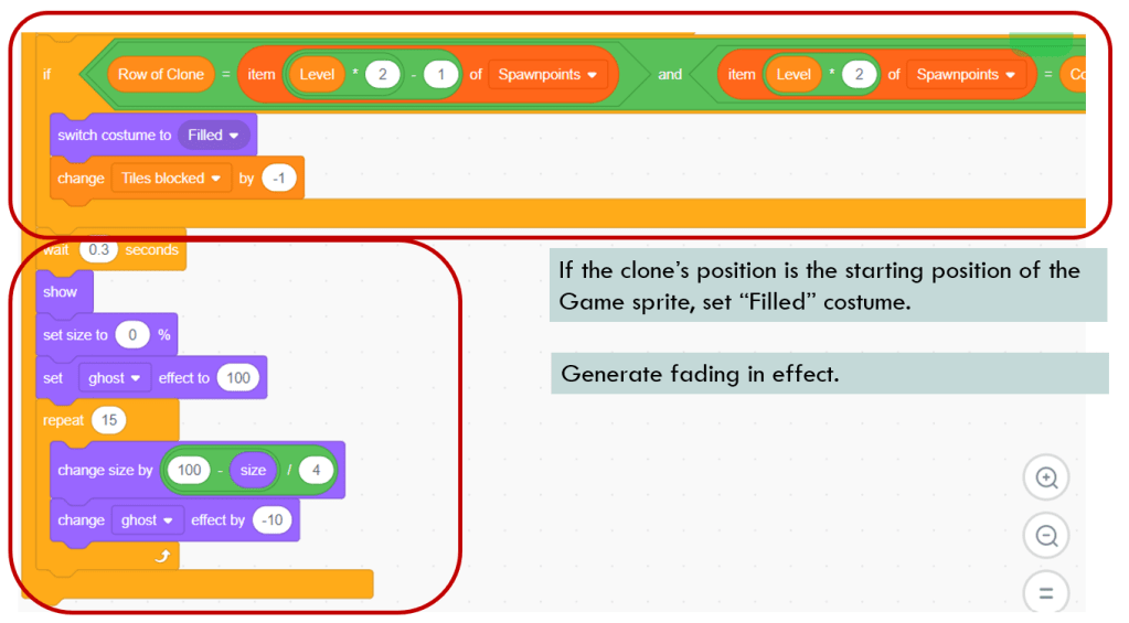 In this code segment, each clone will choose their costume based on the stored value in Levels list. If its costume number is 2 (representing the empty position) or 4 (representing the red tile), decrease “Tiles blocked” variable by 1. If the tile clone’s position is equal to the initial position of Game sprite, set this tile clone’s costume to Fill.