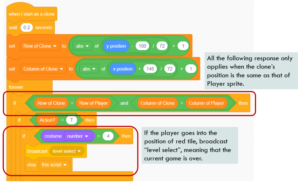 When the clone’s costume number is 4, it means that Game sprite moves to the red tile and game is over. It broadcasts “level select” and stops the running of this code segment.