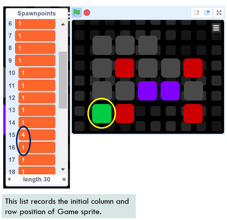 There is another list called “Spawnpoints”. This list stores 30 items which correspond to 15 levels, so each pair of items corresponds to one level. The pair of items records the initial column and row position of the Game sprite. For example, the below sample diagram shows the image of Level 8. The corresponding items in “Spawnpoints” list are item #15 and #16, The initial position of the Game sprite is located at row 4 and column 1, where the green tile locates.
