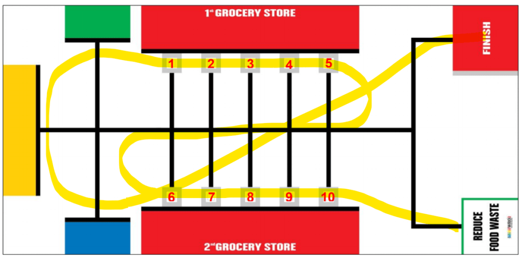 This model is unique because it designs three “tunnels” to collect those color blocks. When the vehicle drives along the “Fruit Placement Area” (the initial position of colour blocks), the HiTechnic colour sensor identifies the colour of each block. If the block is red, the pendulum structure will spin fast and “kick” it into the “Grocery Store” (the red area) like a golf club.