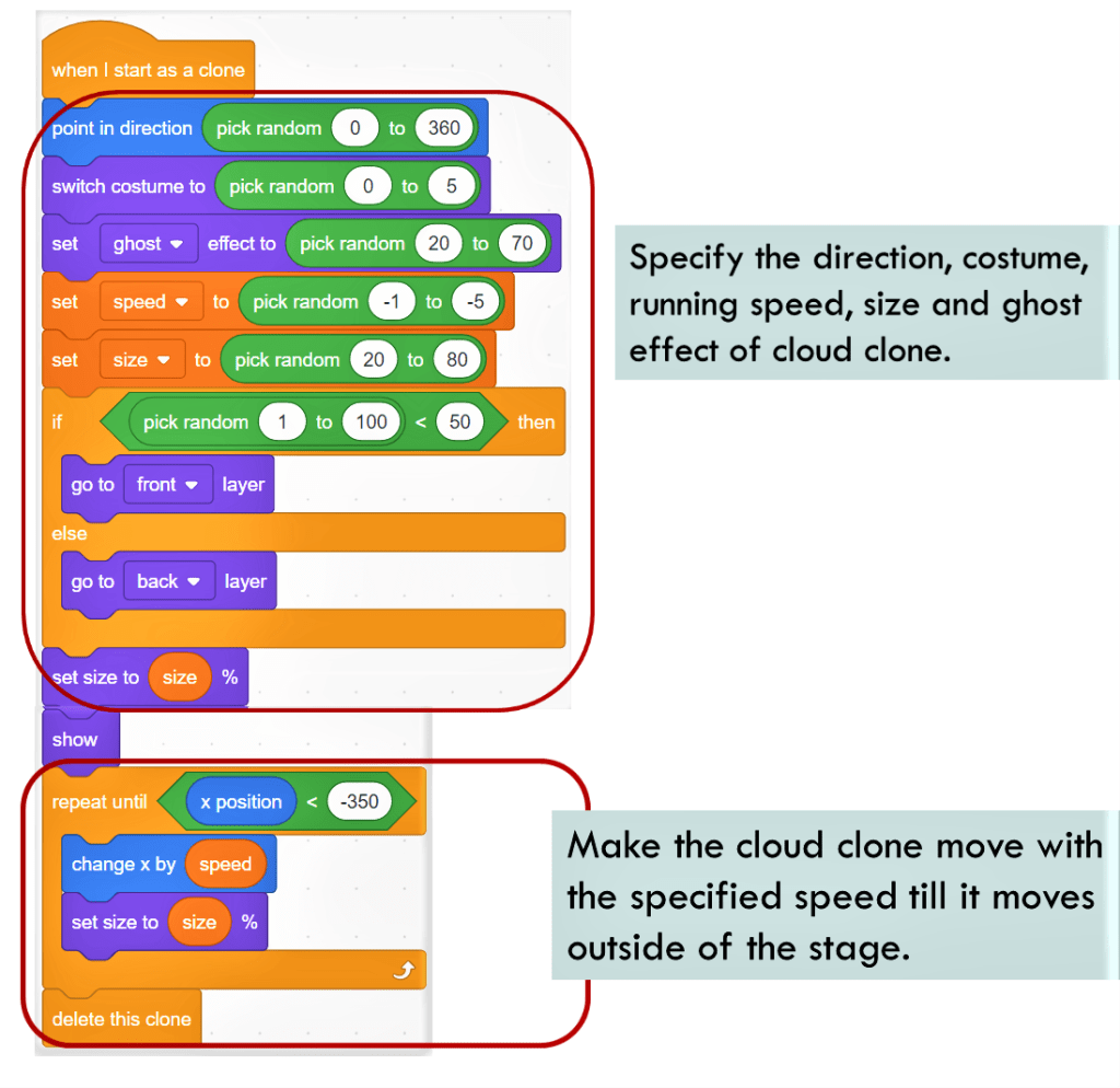 The second parallel code segment of “when I start as a clone” will switch between two costumes of fileball clones to make it look more vivid.