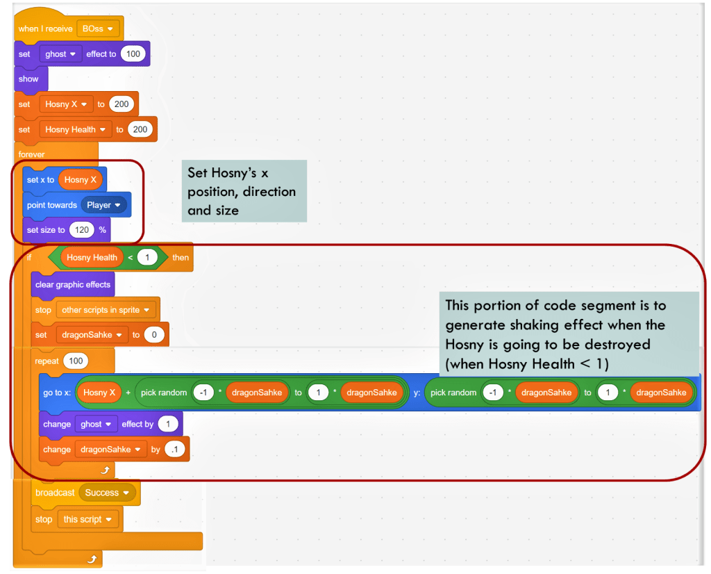 The first code segment is mainly responsible for judging the health status of the Hosny sprite. Horey is always pointing toward Player sprite. Its x position always keeps at 200, close to the right edge of the stage. When “Hosny Health” variable is less than 1, which means that Hosny is going to be destroyed. The program will generate trembling effect for the Hosny by adding random noise value to its x and y positions. I would say the effect is amazing.