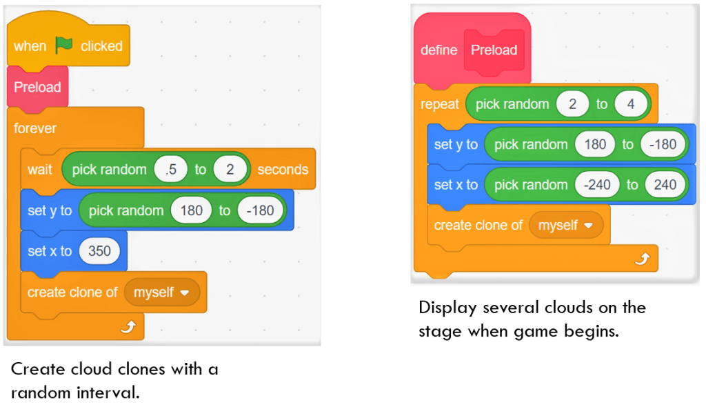 The Clouds sprite will generate a moving backdrop. The real backdrop is just a blue static image. It is the existance of clouds that gives the airplanes a rapid moving context. In “when Green Flag clicked” code segment, the program creates multiple cloud clones with a random interval. In “when I start as a clone” segment, the code sets multiple parameters for those cloud clones. Each clone’s costume, direction, size, ghost effect, moving speed, and layer is set to a random value, bringing more variance to the background setting. If you observe the game carefully, you will notice that sometimes the airplanes wave their way through those cloud clones.