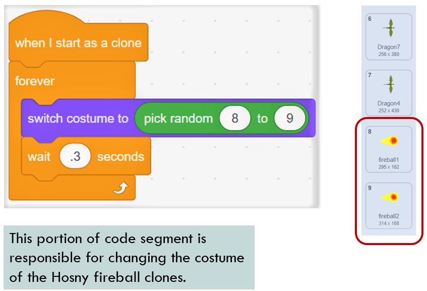 Here the idea is the same as that in Enemies sprite. Enemies sprite contains 3 costumes. Two of them are showing Regular and Purple aircraft images, while the third one is a bullet image. Hosny sprite has 9 costumes. Among them, 7 costumes belong to Hosny image the monster, while the left two costumes (costume 8 and 9) are showing the fireball images. When the program creates clone in #5 segment, it is creating fireballs.