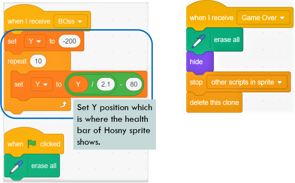 Hosny sprite represents the ultimate evil monster. In “when I receive Game Over” and “when Green Flag clicked”, the code is very simple, just to hide the sprite or delete its clone at the beginning and end of the game.