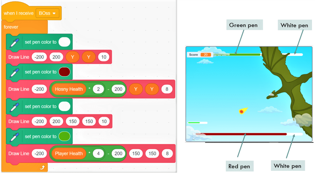 If you are wondering how to show the health value of Player sprite and Hosny sprite dynamically, here is the answer. The function is implemented by Pen sprite.