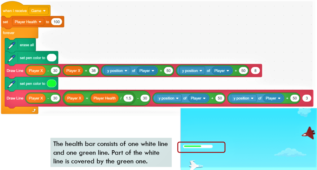 In the code segment “when I receive Game”, it will draw two lines. The white line and green line are drawn from the same starting position. starting x is equal to “Player X – 30”, and starting y is equal to “y position of Player + 50”. Therefore, the two lines will always move together with the Player sprite and hover over it. The white line has a fixed length, while green line’s length is proportional to the health value of Player sprite. The final effect is that you see a health bar which indicates Player sprite’s health status dynamically.