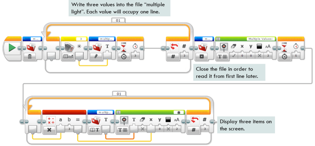 In the following example, the program writes the reflective light intensity of a color sensor into a file called “multiple light” for three times. After that, the program closes the file. The purpose is that the next time it is opened to be read, it starts from the first line.