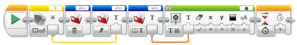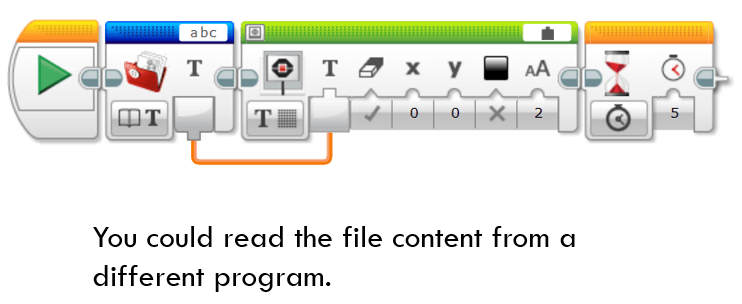 Please note that you could not find the file name from Project Properties window. File Access block is like Variable block in EV3-G in certain degree. When you want to check the values stored in a file, you have to read out via Display block. In the above example, the value of “abc” file is read out and displays on the screen for 5 seconds.