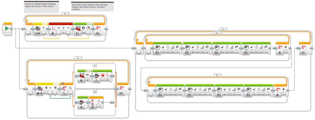 The following is the EV3-G code implementing the similar function as above. Due to the design constraint of EV3 programming blocks, there are lots of wires connecting different blocks, making the program look complicated for beginners.