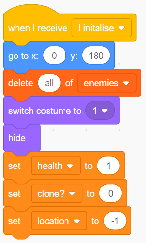 “health” variable is responsible for recording the health status of each enemy clone. “location” variable records the index of created clones. Both of them are local variables, so each enemy clone will keep a unique copy of those variables.