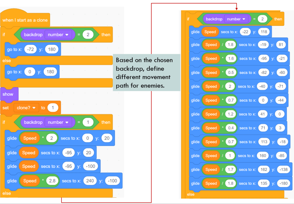 This code segment is responsible for defining the movement path of enemy sprite clone. No matter which map user has chosen, most of routes are not straight, but contain turns or curved path. The program uses several “glide” blocks to defines the running path. Although “glide” block moves the clone straight from starting to ending point, when multiple “glide” blocks connect consecutively, they could simulate a curved route.