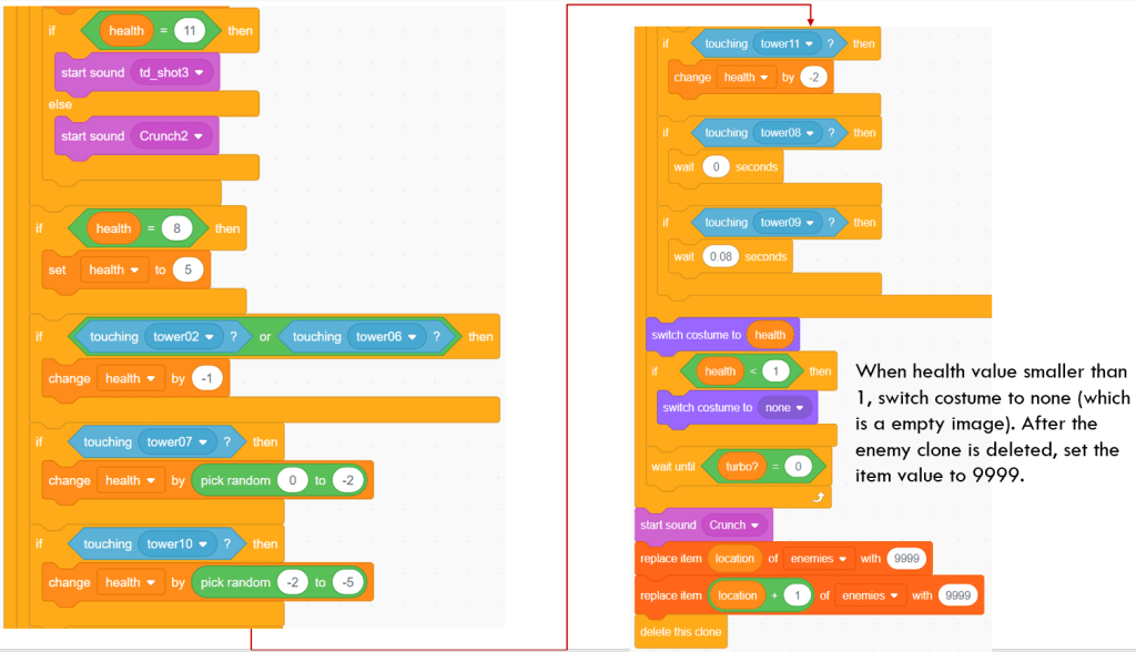 This parallel segment is responsible for handling the interaction between enemy clone and weapons, “health” value is set at the beginning the program and its initial value is higher when enemy clone’s costume number increases. An enemy clone with a high health value indicates that it is difficult to get eliminated.
