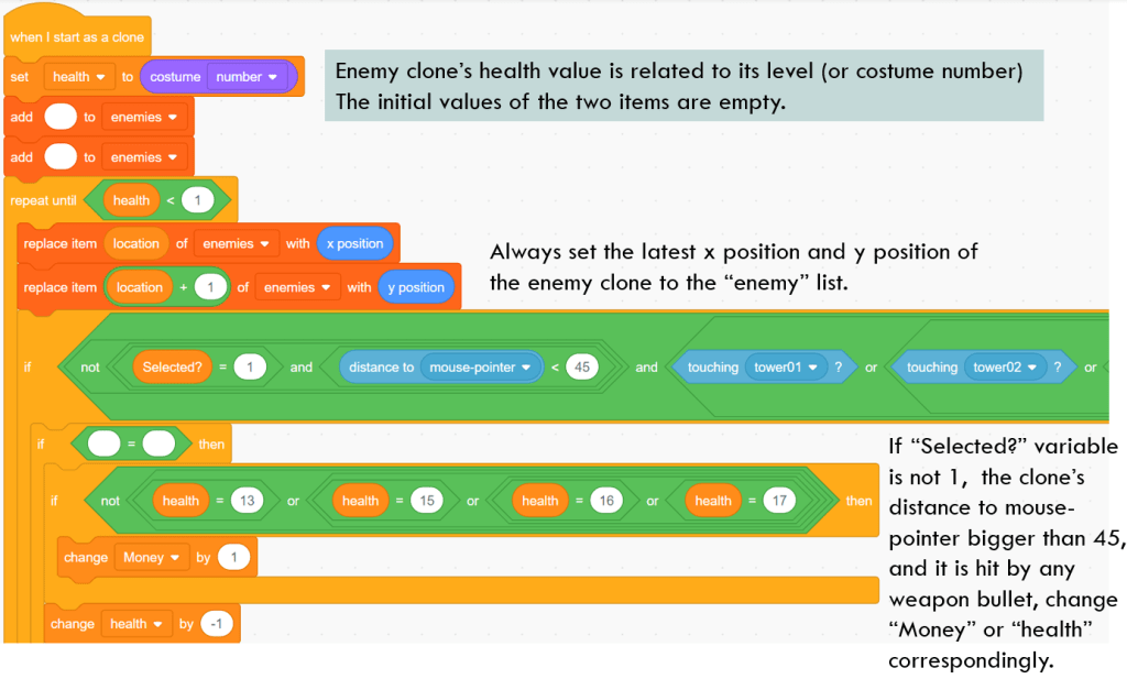 The next code in the loop will check if the enemy clone touches weapon bullet. There are another two conditions needing to be satisfied. One is “selected?” variable equal to 0, and the other is “distance to mouse pointer” not less than 45. When all of those conditions are met, this enemy clone is hit by bullet and its health value gets deducted. When its health value is equal to 0, the enemy clone is deleted and its location value in “enemies” list changes to 9999.