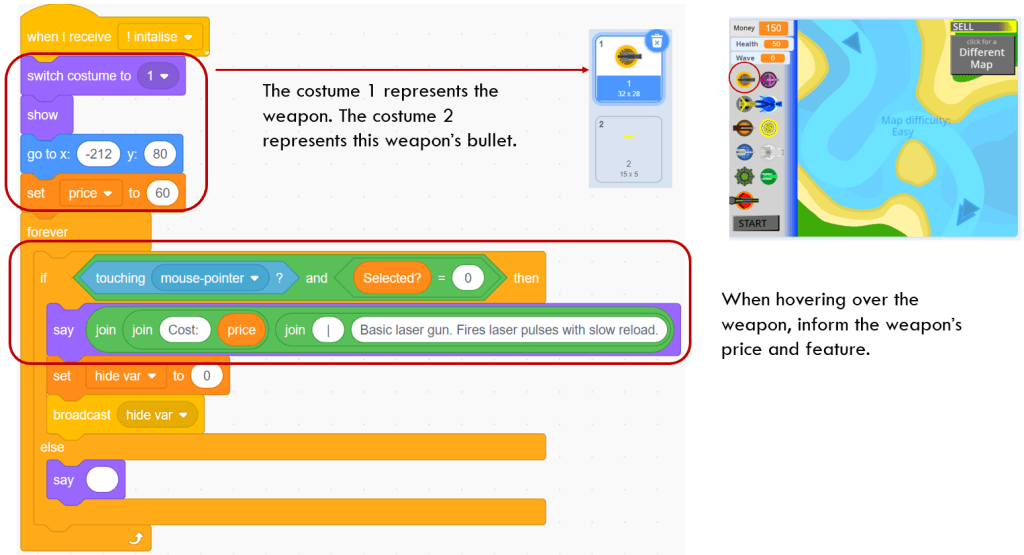 In the code segment of “when I receive !initialise”, when the mouse hovers over Tower01 sprite, the program will inform the user weapon’s price and its feature. Please note the use of variable “Selected?” here. When “Selected?” is equal to 0, it indicates that user has not clicked on the weapon. If “Selected?” is 1, meaning that user has clicked and chosen this weapon, the notification information will not show.