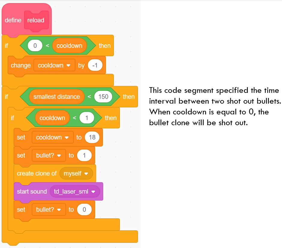 In “reload” block which I will explain below, it sets “bullet?” variable to 1 and creates weapon clone after cooling. When “bullet?” is 1, the above mentioned “when I start as a clone” segment will switch to run the 2nd channel. The weapon clone will use costume 2, and move along the direction specified in “scan” block for 20 steps each time and repeat 15 times. If touching enemy or edge, delete this clone.