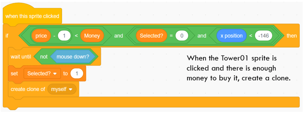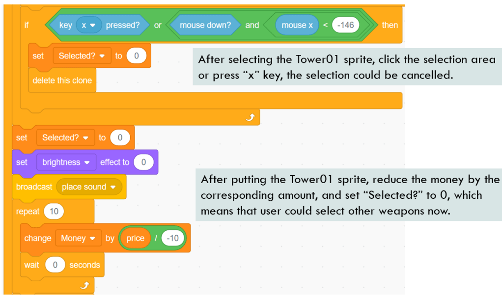 When this sprite is clicked, the program needs to judge if it has enough money to buy this weapon. If money is enough, it will set Selected? to 1, and then create a clone of Tower01 sprite.