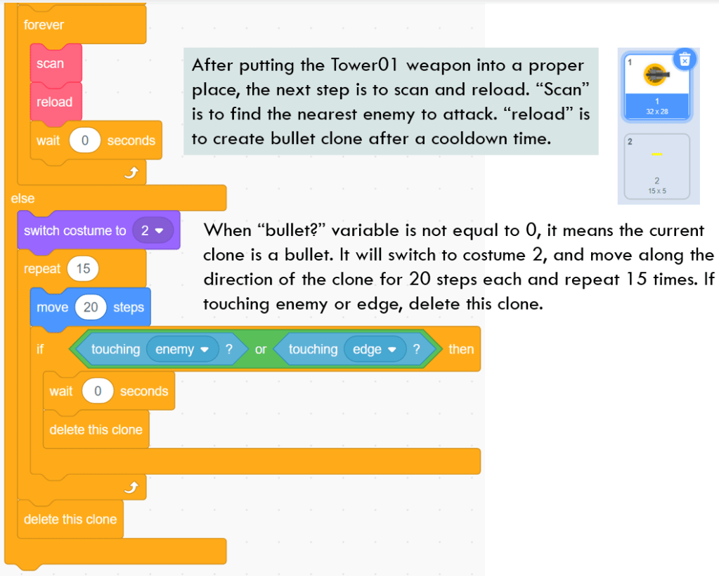 Let’s continue analyzing this segment. After putting the Tower01 weapon to a proper place, the next step is to repeat scaning and reloading. “Scan” is to find the nearest enemy to shoot. “reload” is to create bullet clone after cooling down time.
