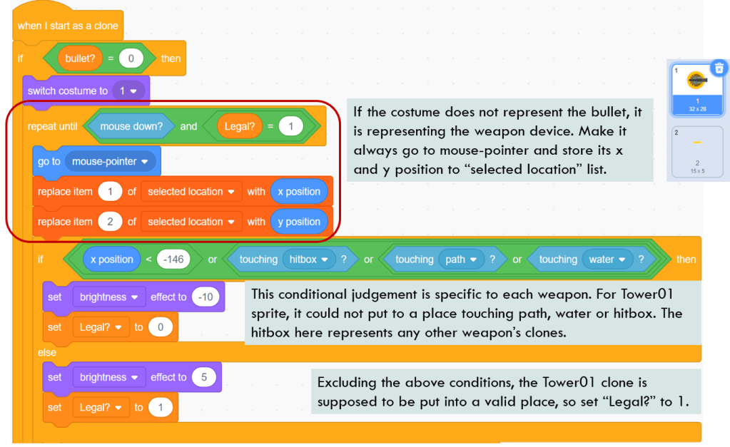 Once Tower01 clone is created, the program will judge the value of “bullet?”. If “bullet?” is equal to 0, it means the clone is not a bullet clone, but a Tower01 weapon clone. The clone always moves with mouse pointer until mouse is clicked and the weapon deploying place is legal.