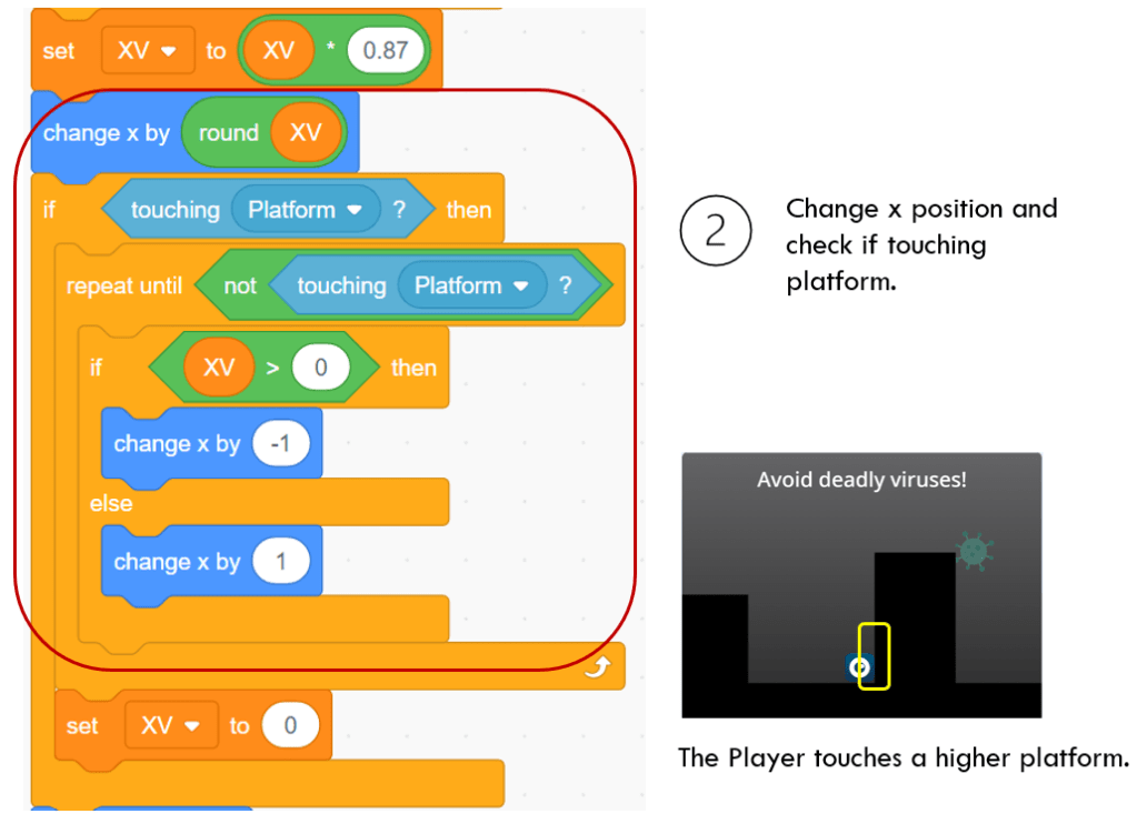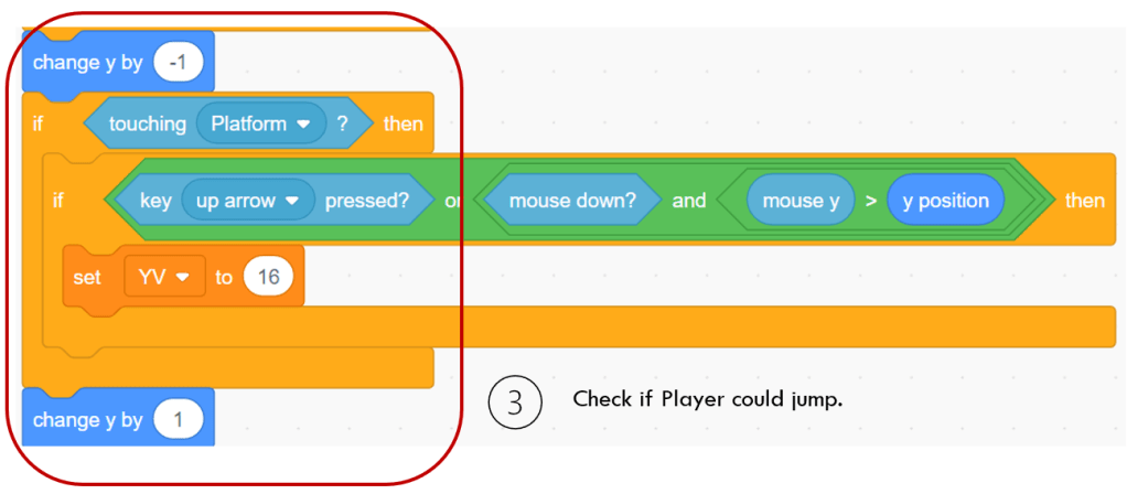 In this Step, the program changes y by -1 and checks if the Player touches Platform. If the Player does, meaning that it is standing on the platform, so when Up arrow key is pressed or mouse clicks over it, the Player will jump up by setting YV to 16.