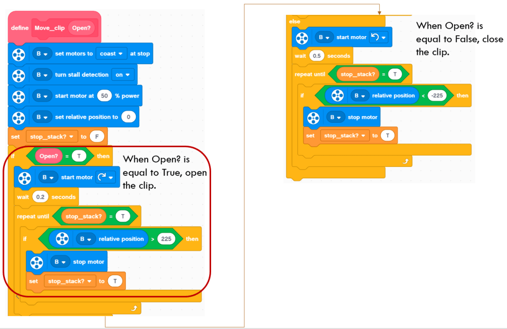 This block is responsible for opening and closing the clip. At the beginning of the block, the program sets the relative position of motor B to 0. If “Open?” variable is T, the motor B will turn clockwise for 225 degrees to open the clip. if “Open?” variable is F, the motor B will turn anti-clockwise for 225 degrees to close the clip.