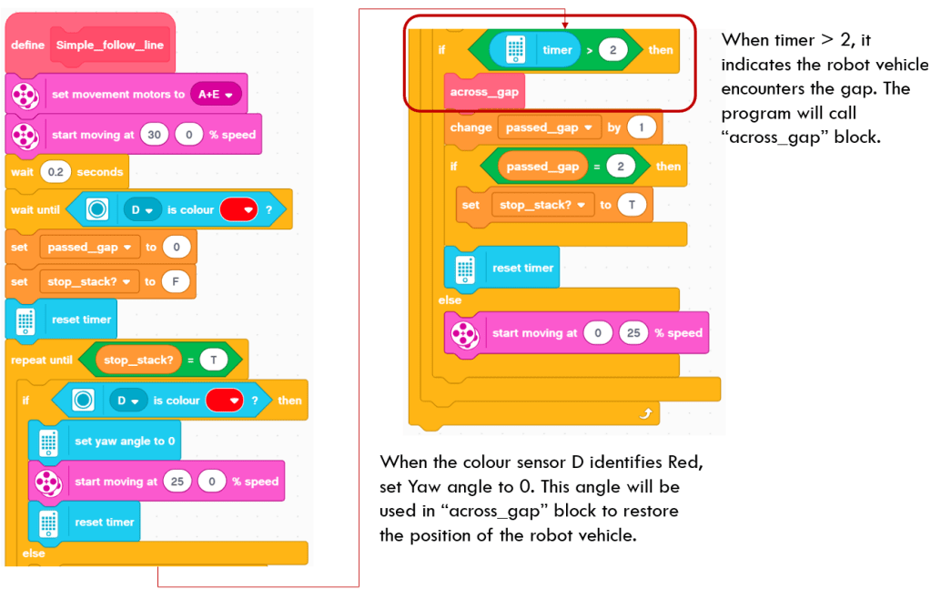 At the beginning of the block, the program sets “passed_gap” to 0 and resets timer. When the colour sensor at Port D identifies red colour, reset its timer again. When timer > 2, it indicates that the robot vehicle could not find red line within the last 2 seconds. The program judges that it encounters a gap. It calls “cross_gap” block, which I will introduce soon. After the vehicle passes two gaps, this program block finishes its task and exits.