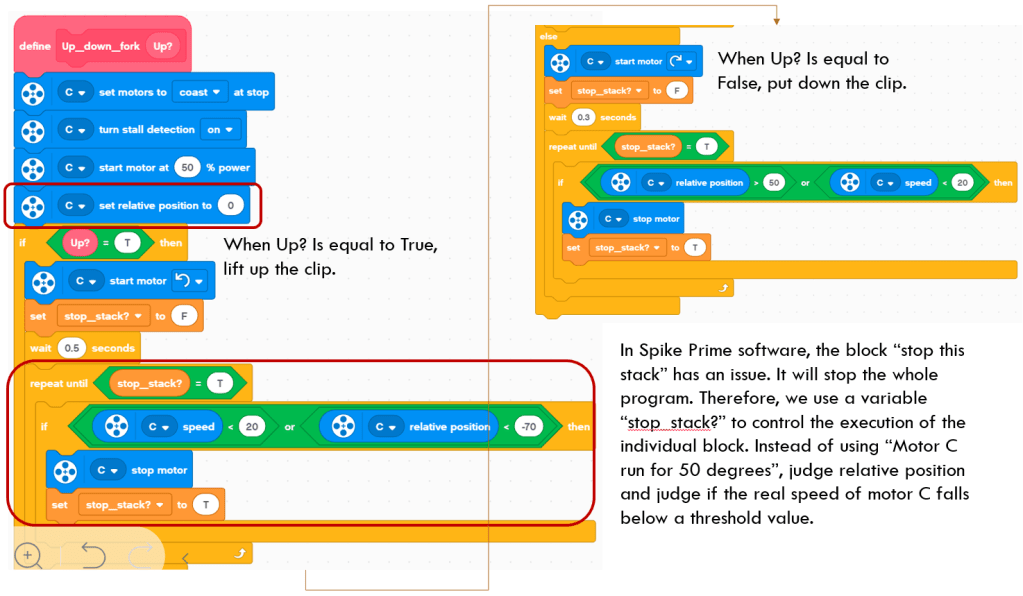 This block is similar to the above “Move_clip” block. The difference lies in an extra conditional judgement of “C speed < 20”. This judgement is necessary since the up and down movement of Motor C is within a small range. When the motor C spins down to touch the ground, yet not reachches the relative position, the program will get stuck. If adding conditional judgement of “C speed > 20”, when the motor C touches the ground, the conditional judgement becomes True, the motor C stops and this block finishes its task.