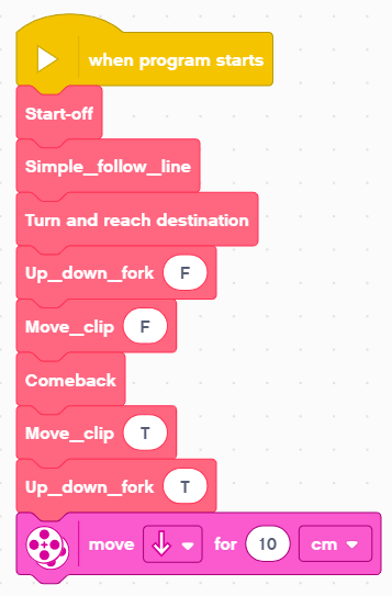 After the main code segment finishes executing “Comeback” block, it will call “Move_clip” to put down the ball. After that, the program calls “Up_down_fork” block to lift up its front attachment. The last step for the vehicle is to retreat 10 centimeters to indicate the accomplishment of its mission.