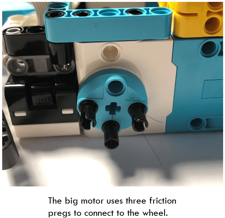 For the two wheels, they are connected to big motors via three black frction pregs.