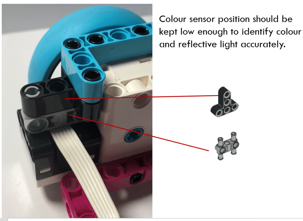 The colour sensor is mounted to the big motor through a T-shape beam and a connector beam, as shown below. The bottom of the colour sensors is aligned with the chassis.