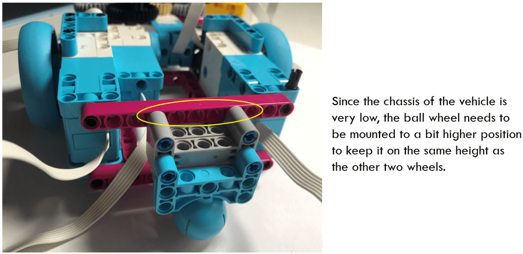 The rear part is left for installing the ball wheel. In Lego Spike Prime, ball wheel is much easier to be mounted than in LEGO MindStorms EV3. Since the chassis of the vehicle is very low, the ball wheel needs to be mounted at a bit higher position to keep the three wheels on the same height. It is mounted to the red beam through two stacked I-beam (gray colour).