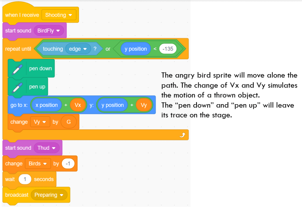 Once the player releases the mouse, “shooting” message is broadcasted. In the receiver procedure of “Shooting” message, the Angry Bird sprite changes its x and y position by Vx and by Vy in each iteration until it touches the edge or the ground (y position < -135). Meanwhile, the block of “pen down” and “pen up” will record its position as points to show its trajectory in air beautifully.
