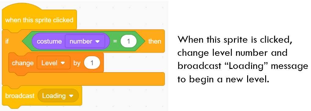 in “when this sprite clicked” code segment, when costume number is 1, it meaning that “next level” costume is used, the program will change Level variable by 1 and broadcast Loading message. Otherwise, it means that user has not cleared the current level, so the costume name is Play Again and the program only broadcasts “Loading” message.