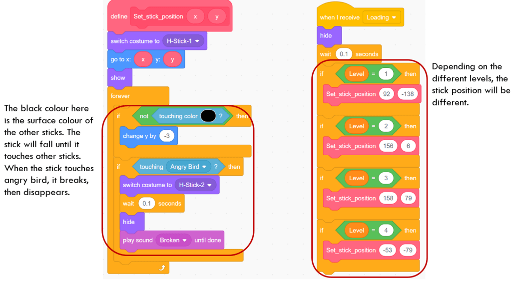 After receiving “Loading” message, the stick will check whether it is touching Black colour. The Black colour is drawn on the surfaces of sticks. If the stick is put horizontally, its cylindrical surface is drawn in Black. However, if the stick is put vertically, its end surfaces are drawn in Black. In this way, horizontal and vertical sticks support each other to form a frame. When a stick could not touch any Black colour, the program assumes that the stick loses support from the underneath. The Stick sprite should change y by -3 continuously until touching other sticks or ground (ground surface is also drawn with Black colour).