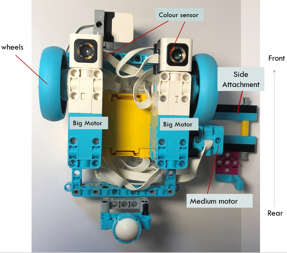 In the bottom view, we could see that two colour sensors are attached on the front of the vehicle, seating on both sides. For this mission, two colour sensors are necessary, otherwise, the program could not identify the intersection of the black lines, where the object is located.