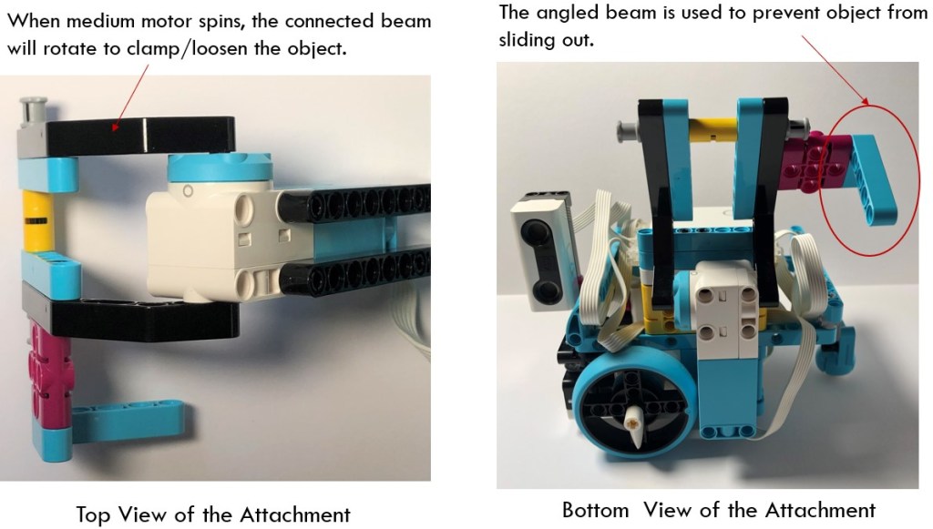 Finally, I will introduce the side attachment. Its structure is simple. Two angled beams (black) are connected on both sides of the medium motor. When motor spins, the beams rotate up or down. When the beams spin down, they catch the object inside and drag it moving with the vehicle. You might notice another angled beam (blue) attached at one end of the attachment. It is used to block the object from sliding out.
