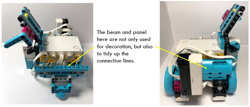 Two big motors are used to drive wheels, while a medium motor is used to spin the side attachment. The castel wheel is attached at the rear part to keep the vehicle well balanced.