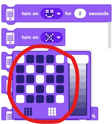 This function will specify the image shown on the light matrix. In programming block version, we could specify the light shape or image through visual editing in “turn on” block, as shown below.