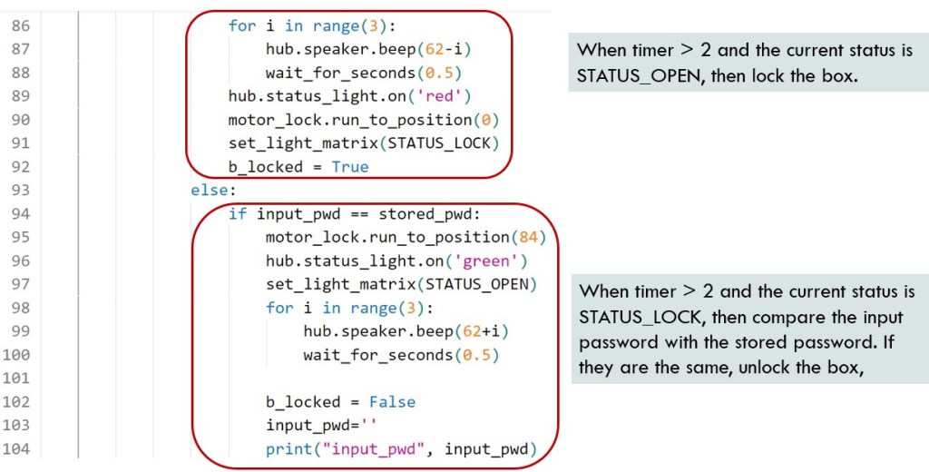 If b_locked is True, indicating the box has been locked and the user wants to open it, the program will compare “input_pwd” with “stored_pwd”. If the values match, the program will turn the motor to a position of 84 and open the box. Otherwise, the program will show cross sign on light matrix and still lock the box.