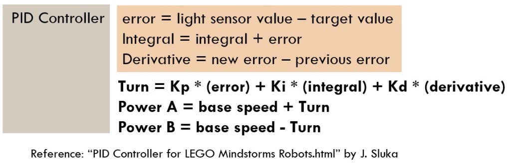 If you have designed a robot vehicle to follow a line, you might not feel strange about PID control. When following the line, the robot vehicle compares the reflective light of the Color Sensor with the target value, and gets error, integral and derivative values. It calculates how much power should apply to left motor and right motor respectively.