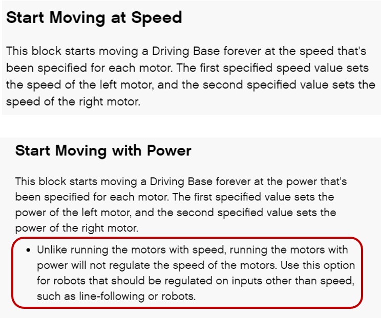 Another point is to ensure using “start moving at … %power” on the last line of the PID control code. As mentioned in the Help Document, “start moving at %power” block is used when the program needs to regulate the input of robot, such as line-following robots. If you use blocks “start moving at speed”, you might not be able to realize PID control.