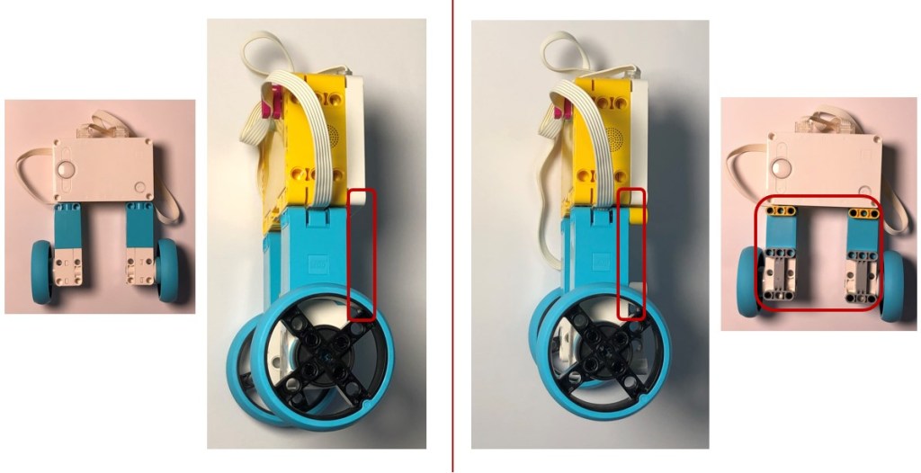 One factor to influence the balance is the wheel size. The wheel size in core set is 5.6cm in diameter. The wheel size in expansion set is 8.8cm in diameter. If you change small wheels to big ones, with the same motor power, the distance of the wheels traveling per rotation is different. We need to adjust parameters to accommodate this difference.