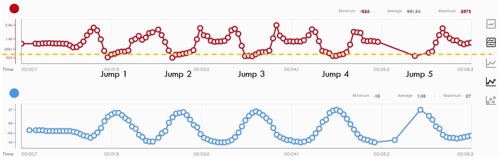 After this adjustment, we could record data and check the line graph again. This time, the data is not so dense. The data missing still exists (around the jump 5) but at least the data of several jumps (jump 1 to jump 4) are complete.