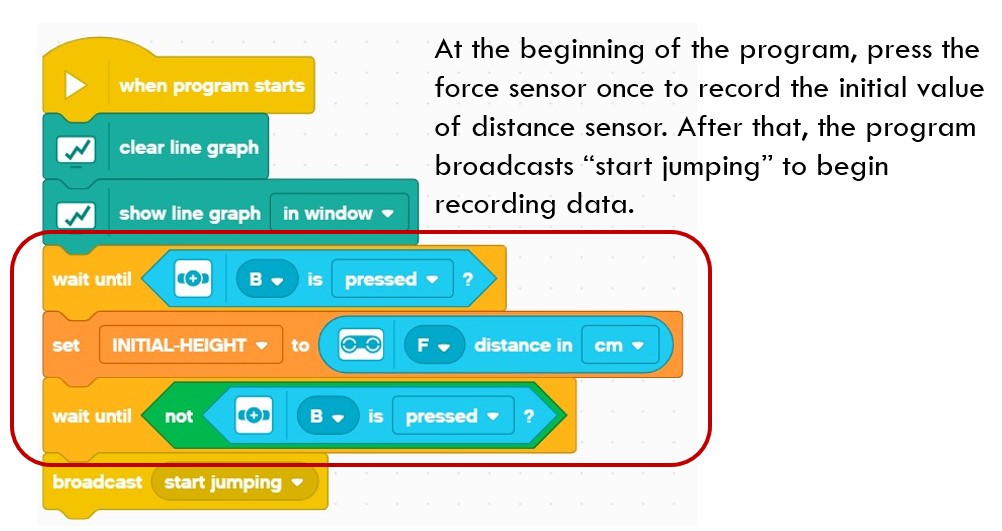 Once getting the initial value of distance sensor, the program broadcasts “start jumping” message.