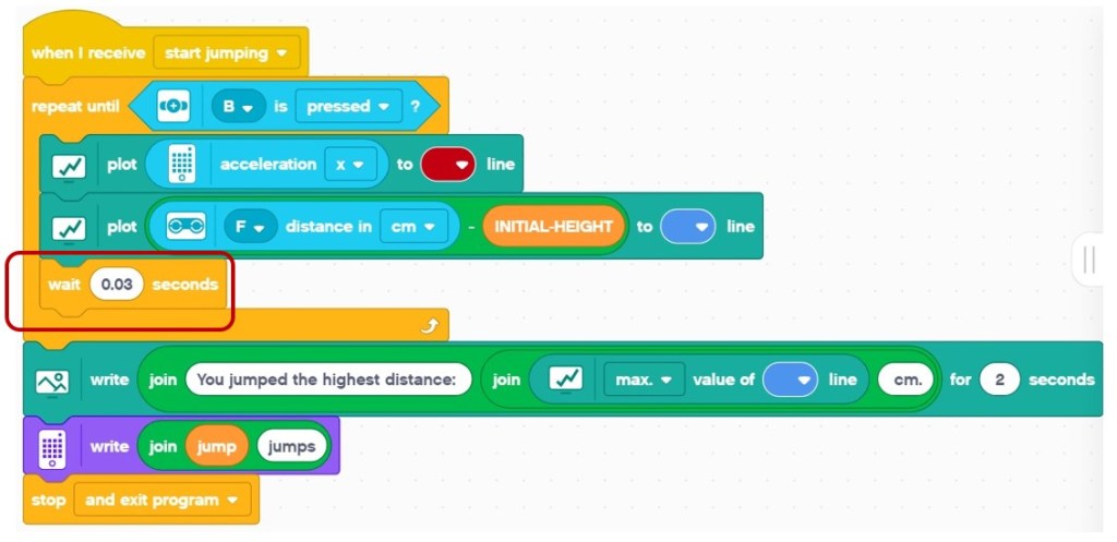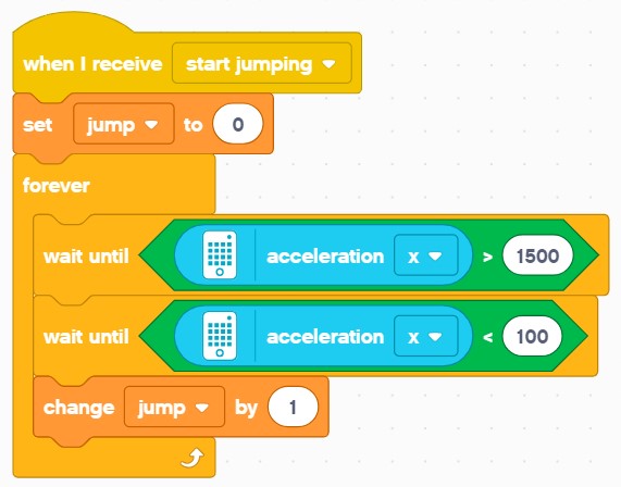 In code segment of “when I receive start jumping”, it begins collecting accelerometer’s data and the value change of distance sensor. In the previous section, we know that “acceleration x” represents the acceleration on vertical direction. We do not care the value change in the horizontal plates, so we only need to collect value of “acceleration x”, and ignore “acceleration y” and “acceleration z”.