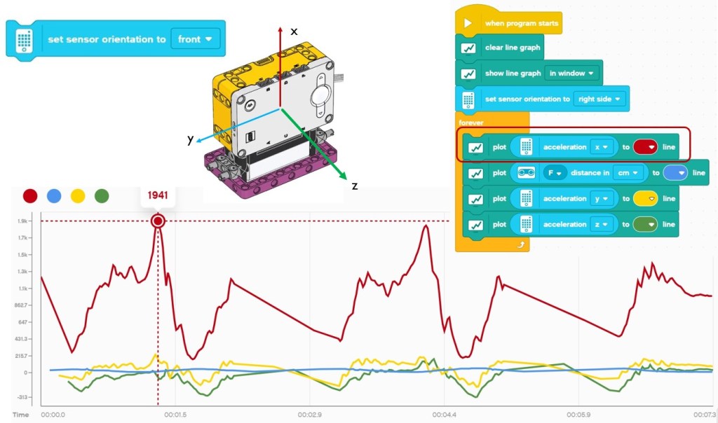 In LEGO Spike Prime, its smart hub embeds a motion sensor, which combines a three-axis accelerometer and a three-axis gyroscope. An acceleration sensor measures the acceleration applied to the device. Please note the existence of gravity might confuse you when reading the vertical acceleration value of accelerometer. The row data contains the acceleration of gravity: 9.81 m/ s2. Therefore, to measure the real acceleration of the device, the contribution of the force of gravity must be removed from the accelerometer raw data.Â