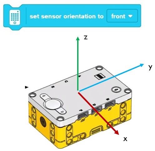 Setting sensor orientation to different values will affect the direction of x, y and z axes. For example, if we use the default sensor orientation of “front”, positive direction of x, y and z axes are shown in the above image.