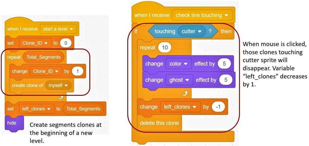 In another event receiver procedure “when I receive check line touching”, the program checks if a specific segment clone touches the Cutter sprite (yellow line). If it does, the segment clone could change color and ghost effect for 10 times, and gets deleted. The variable “left_clones” decreases by 1 to indicate how many segment clones still existing on the stage.