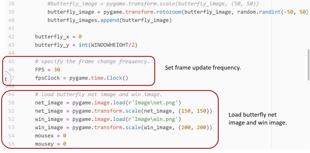 For the butterfly sprite, we have 8 pictures to capture its different postures. If it is in Scratch, what we need to do is to store all of them as 8 costumes. In Python, all of the 8 images should be loaded and stored in a list, which is named “butterfly_images”. pygame.transform.rotozoom function could used to rotate and scale the loaded image.